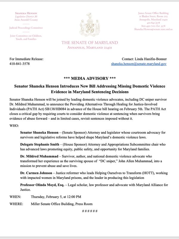 Senator Shaneka Henson will be joined by leading domestic violence advocates, including DC sniper survivor Dr. Mildred Muhammad, to announce the Providing Alternatives Through Healing for Justice-Involved Individuals (PATH Act) SB138/HB084 in advance of the House bill hearing on February 5th.